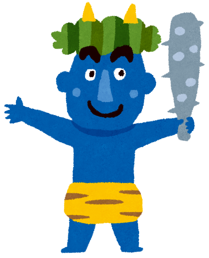 An oni (variously translatable as “demon” or “devil,” “ogre,” etc.) is a mythical monster. Sometimes horned, often but not always inimical to humans, often portrayed as red- or blue-skinned, club-carrying (whence the kotowaza), and cannibalistic – although originally they were invisible spirits of misfortune. They play a role in the springtime festival of Setsubun.