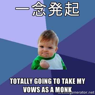 Alternately: Firm resolve to carry something through; a sincere and wholehearted intention. Originally used to describe the Buddhist resolve to leave “the world” (i.e. society) behind and take up religious practice, once a common step for aristocrats who had had enough of life at court, the phrase now refers to any such resolution to change one’s ways for the better or achieve a specific goal.
